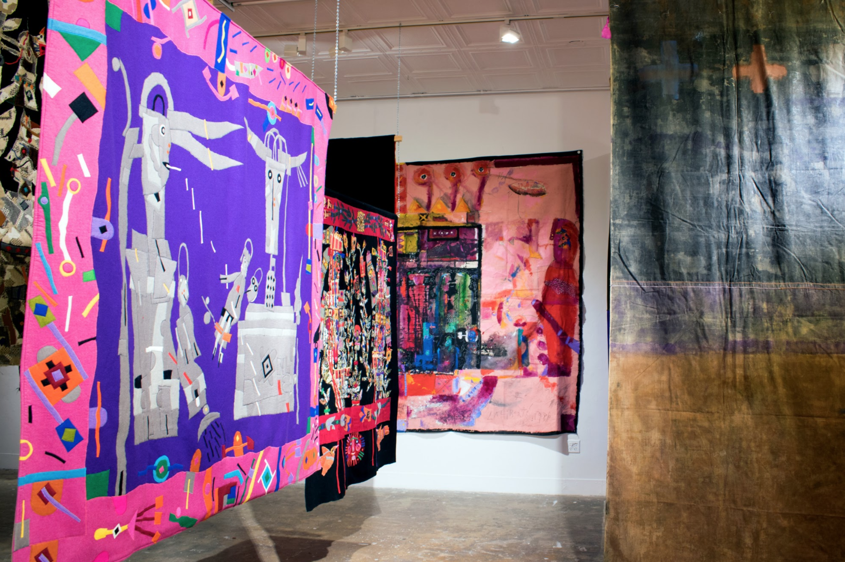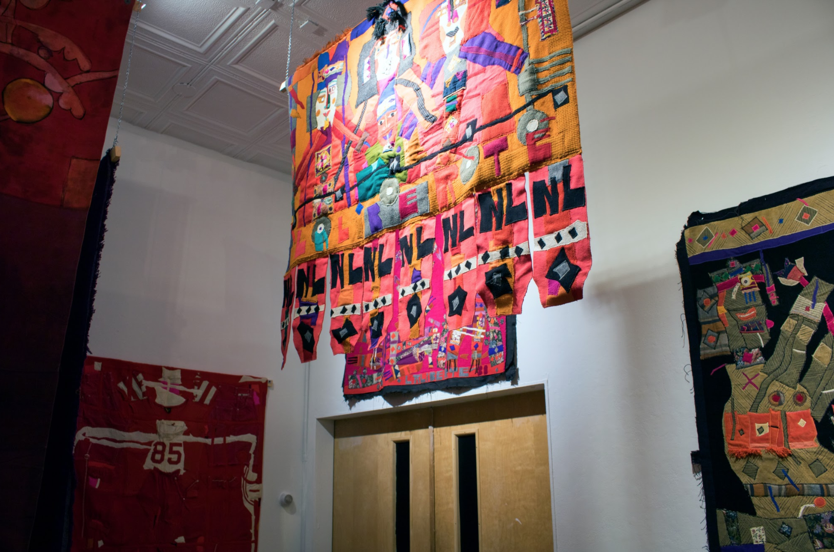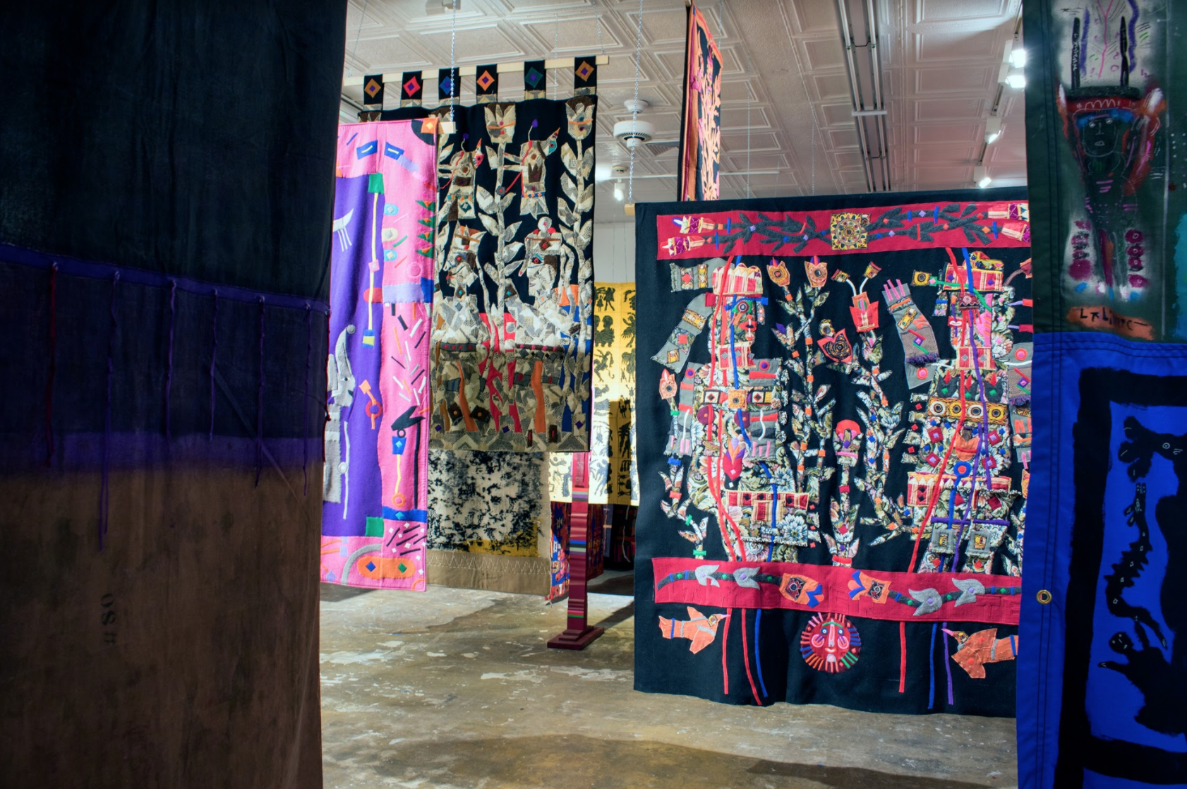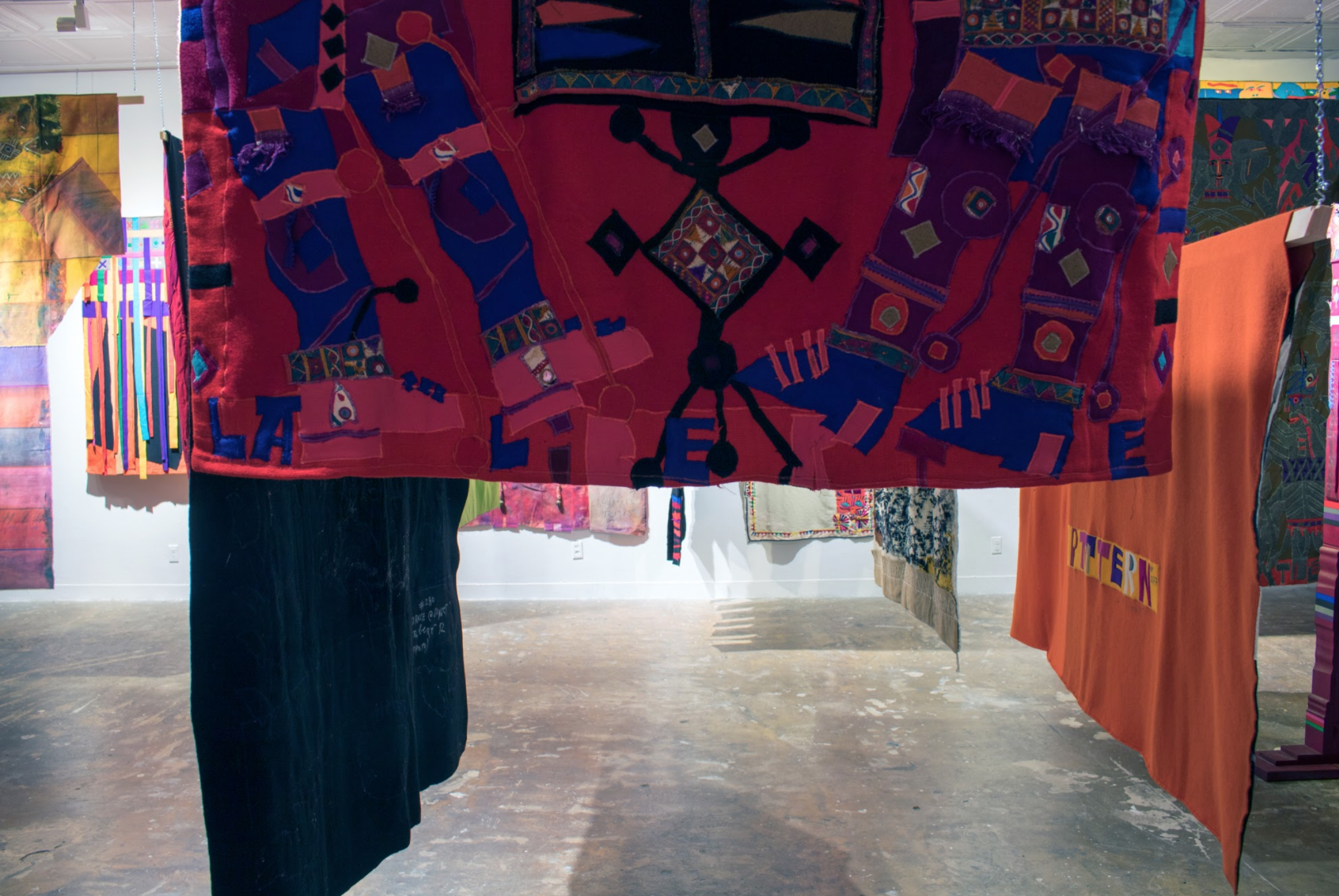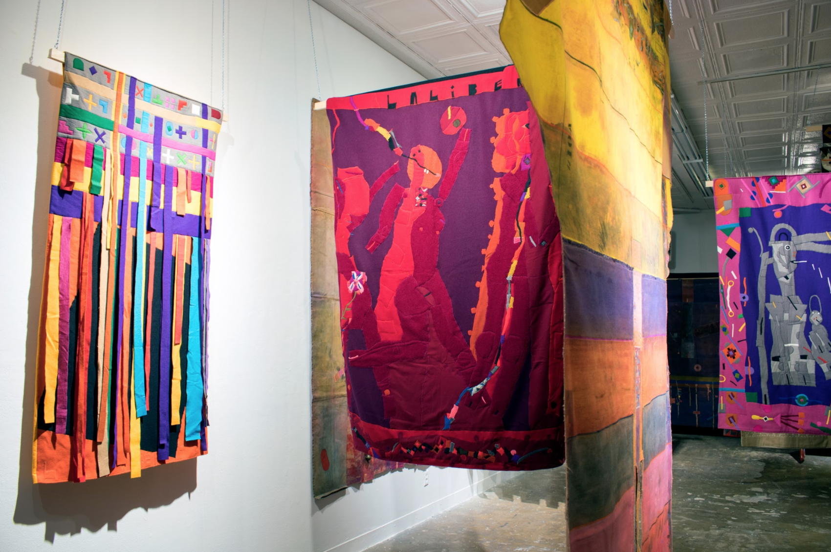 Inside the Mind of a Maker is a document and a fiction, a retrospective and interpretation, of the consciousness of the prolific artist, Norman Laliberté. The stage is set as a cartographic journey through the years and various materials used throughout Laliberté’s career. The forty-two banners displayed in the gallery range from the 1960s to the 2000s and represent his numerous explorations of form and content, from completely abstracted color studies to pictorial likenesses resembling ancient hieroglyphics. Figures, flora, fauna, gods, and ghosts dance upon the tapestries portraying tales and vignettes as complex as the great sagas of antiquity. Think of your time in the labyrinth as a hero’s quest; venture into the banners and experience the intricacies inside the mind of maker…you might be surprised at what you’ll find!