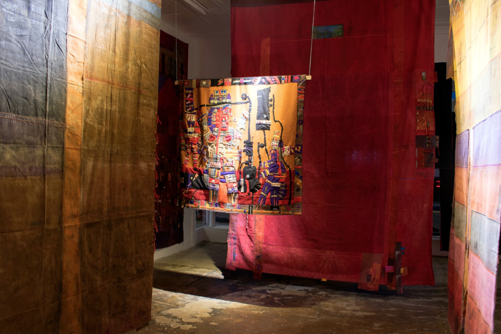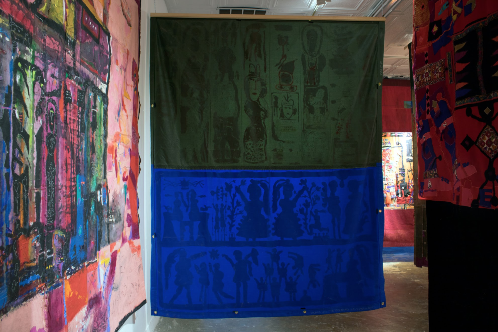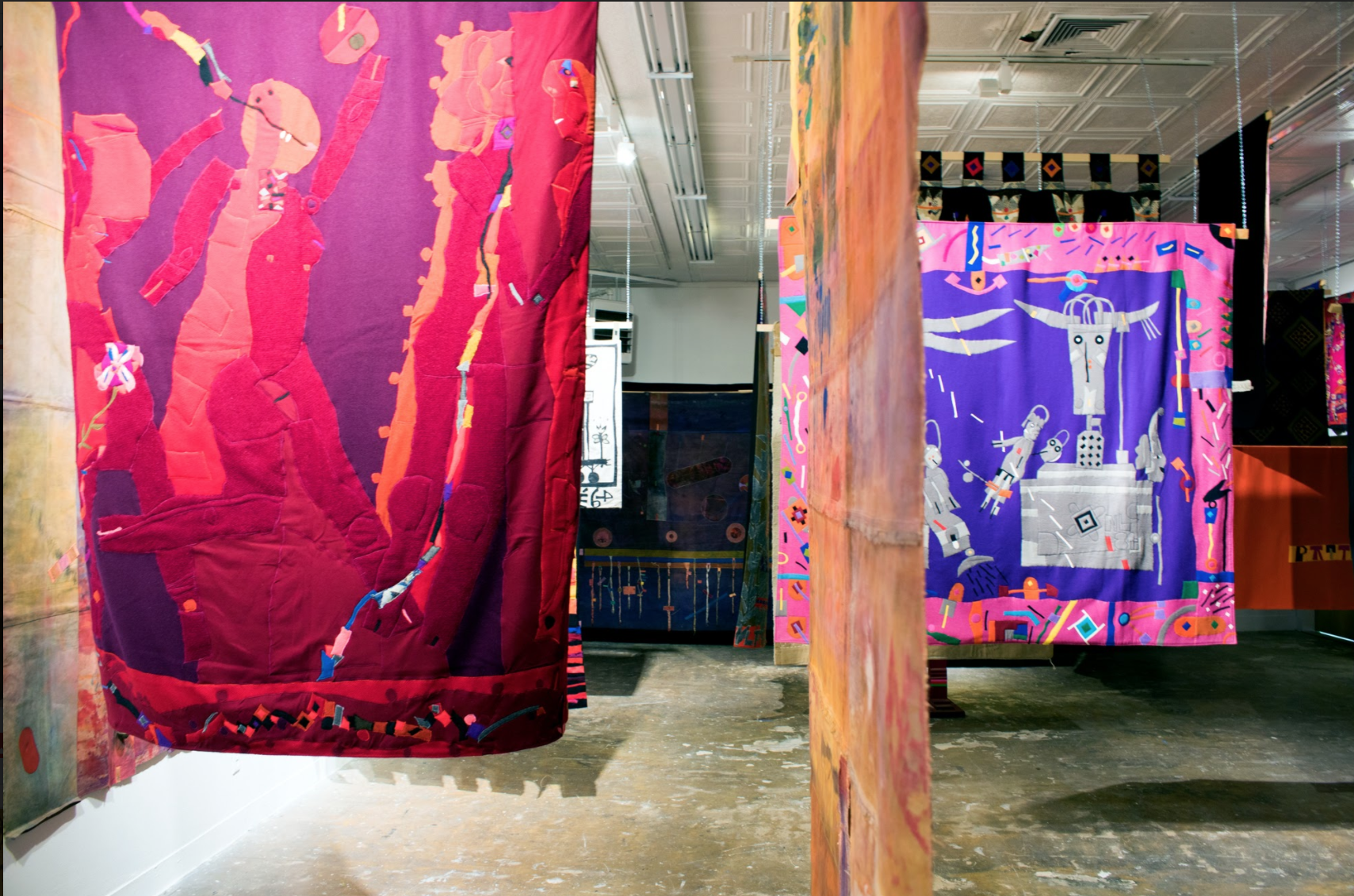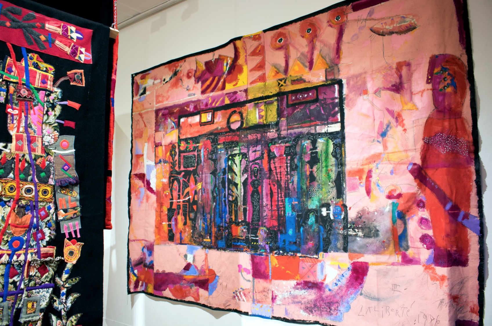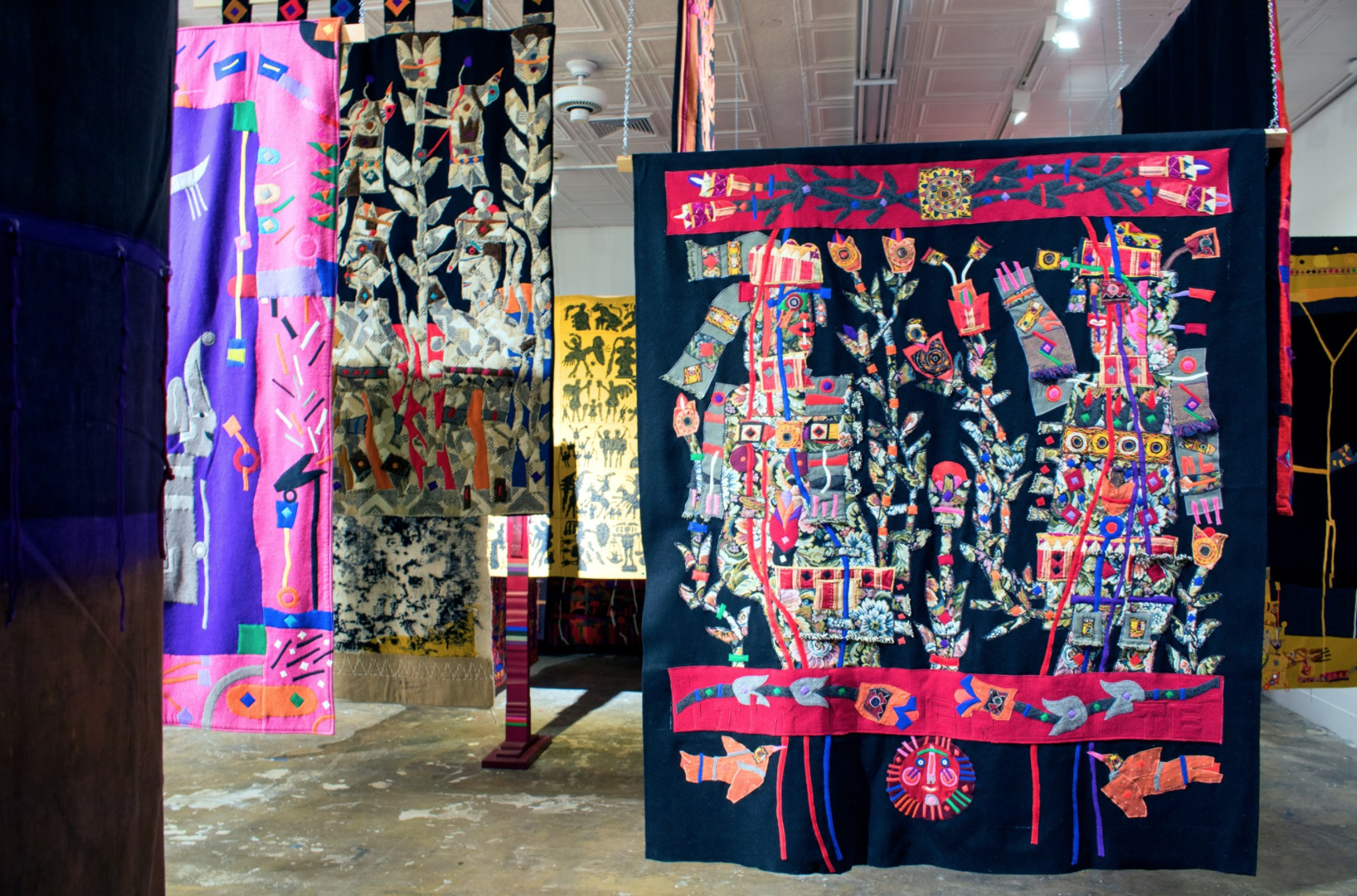 Inside the Mind of a Maker is a document and a fiction, a retrospective and interpretation, of the consciousness of the prolific artist, Norman Laliberté. The stage is set as a cartographic journey through the years and various materials used throughout Laliberté’s career. The forty-two banners displayed in the gallery range from the 1960s to the 2000s and represent his numerous explorations of form and content, from completely abstracted color studies to pictorial likenesses resembling ancient hieroglyphics. Figures, flora, fauna, gods, and ghosts dance upon the tapestries portraying tales and vignettes as complex as the great sagas of antiquity. Think of your time in the labyrinth as a hero’s quest; venture into the banners and experience the intricacies inside the mind of maker…you might be surprised at what you’ll find!