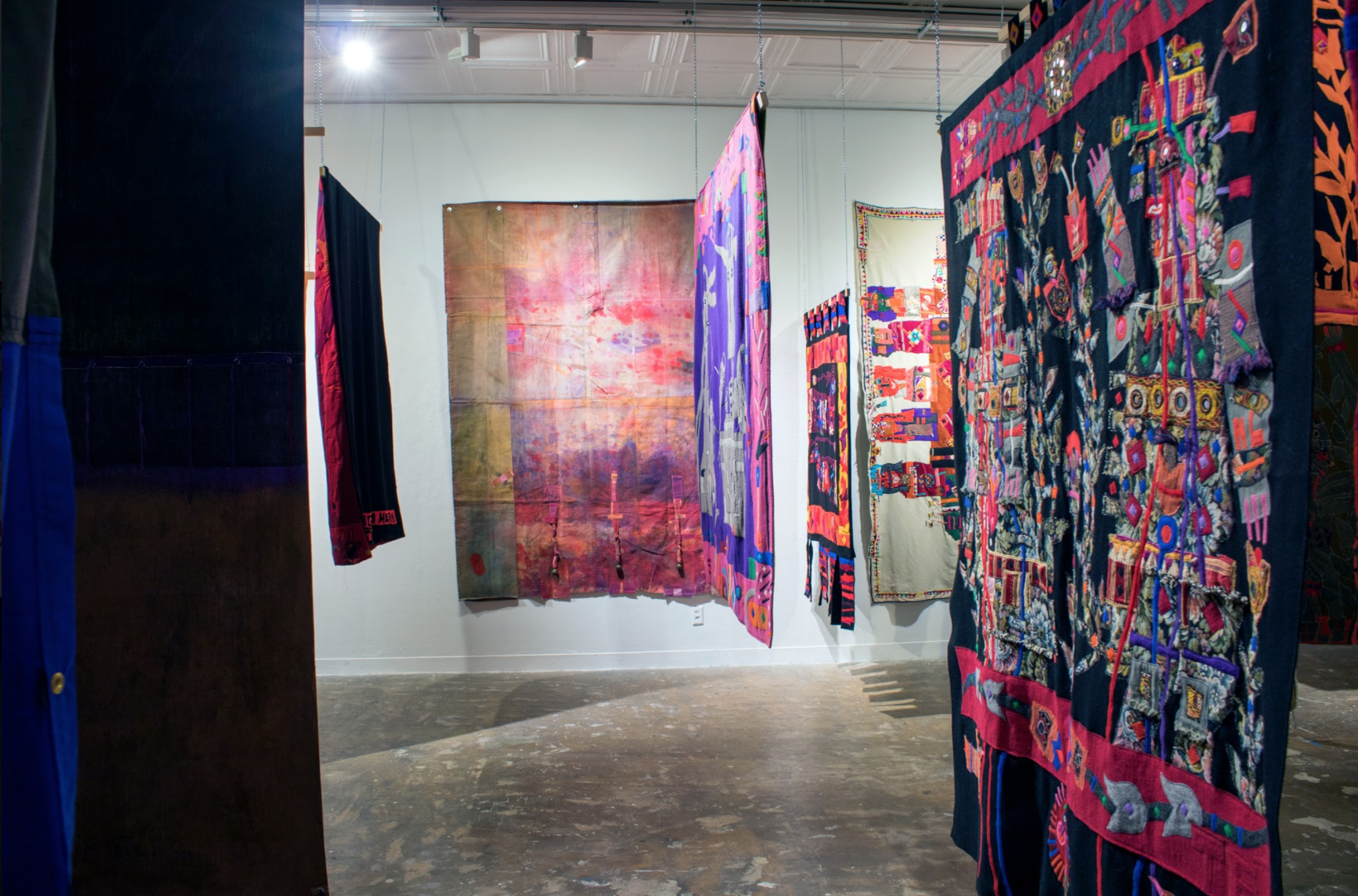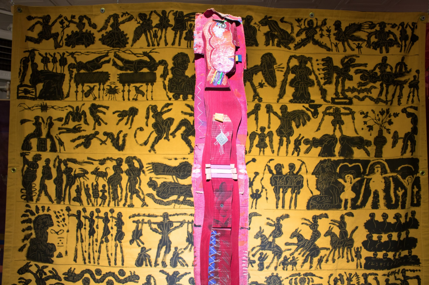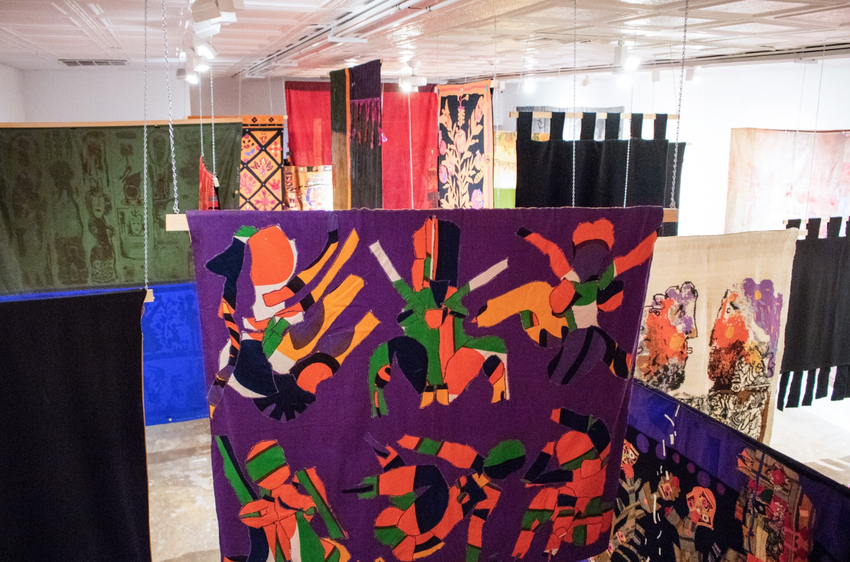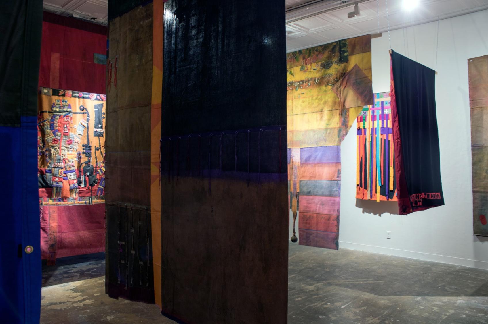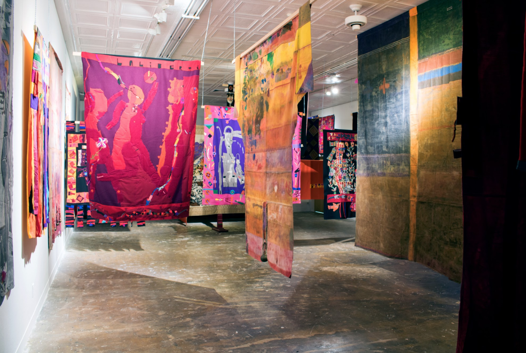 Inside the Mind of a Maker is a document and a fiction, a retrospective and interpretation, of the consciousness of the prolific artist, Norman Laliberté. The stage is set as a cartographic journey through the years and various materials used throughout Laliberté’s career. The forty-two banners displayed in the gallery range from the 1960s to the 2000s and represent his numerous explorations of form and content, from completely abstracted color studies to pictorial likenesses resembling ancient hieroglyphics. Figures, flora, fauna, gods, and ghosts dance upon the tapestries portraying tales and vignettes as complex as the great sagas of antiquity. Think of your time in the labyrinth as a hero’s quest; venture into the banners and experience the intricacies inside the mind of maker…you might be surprised at what you’ll find!