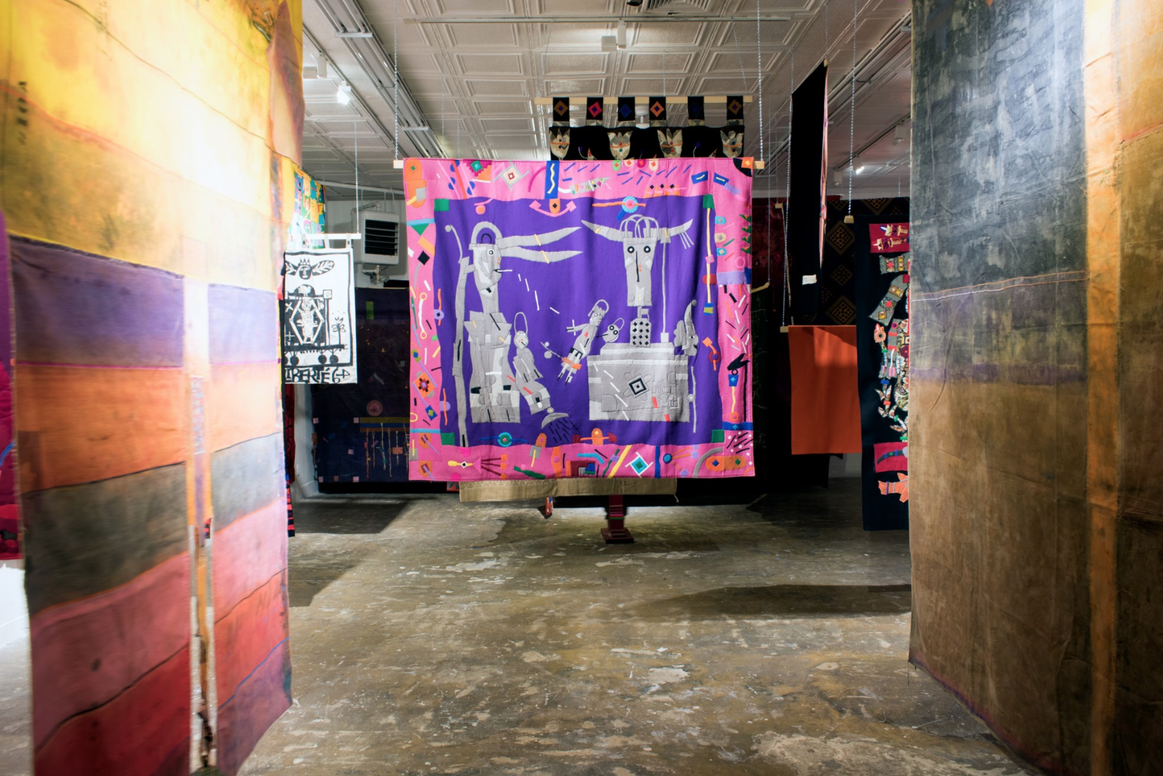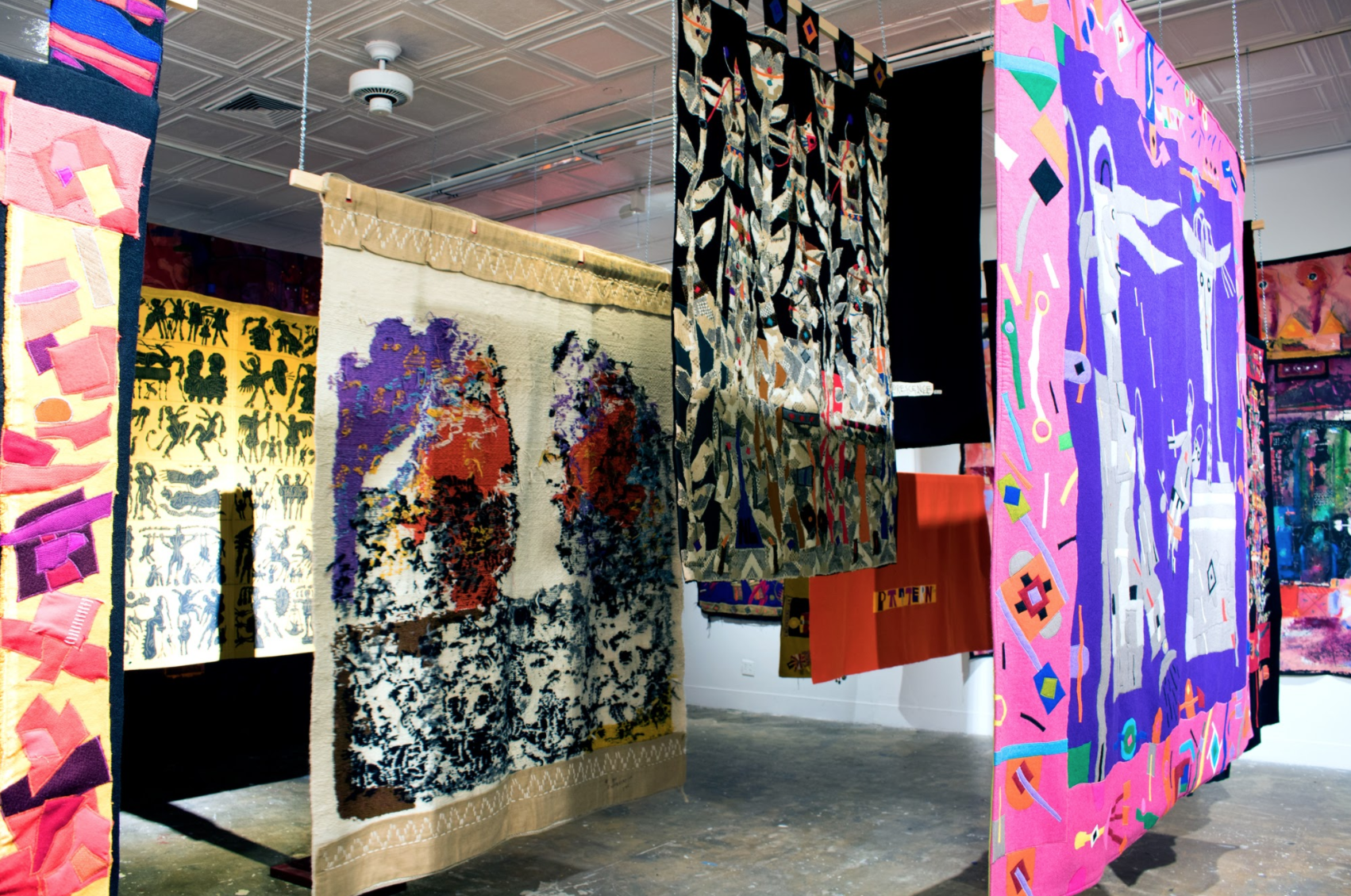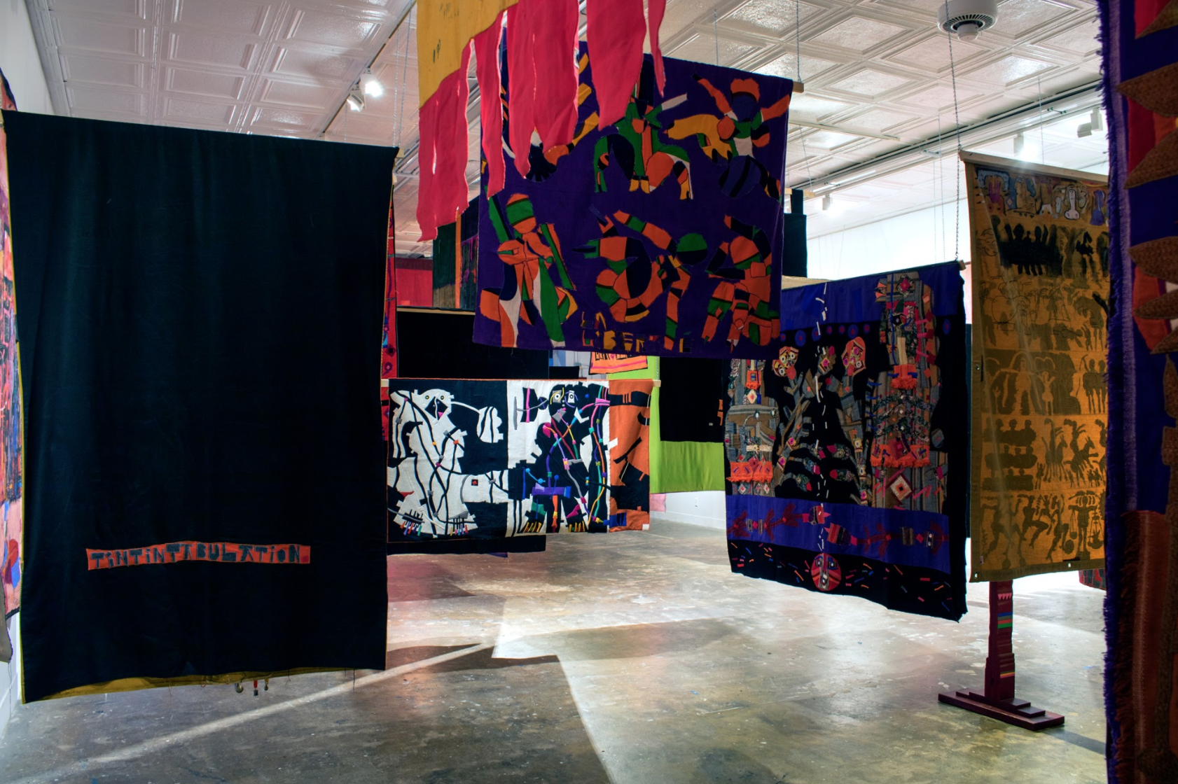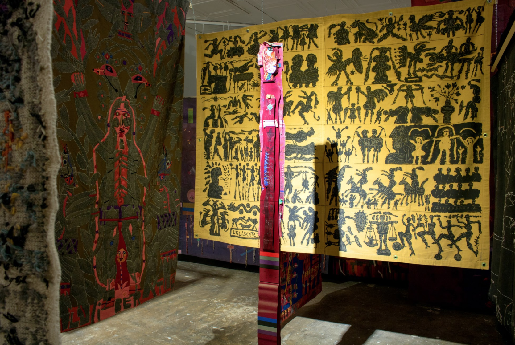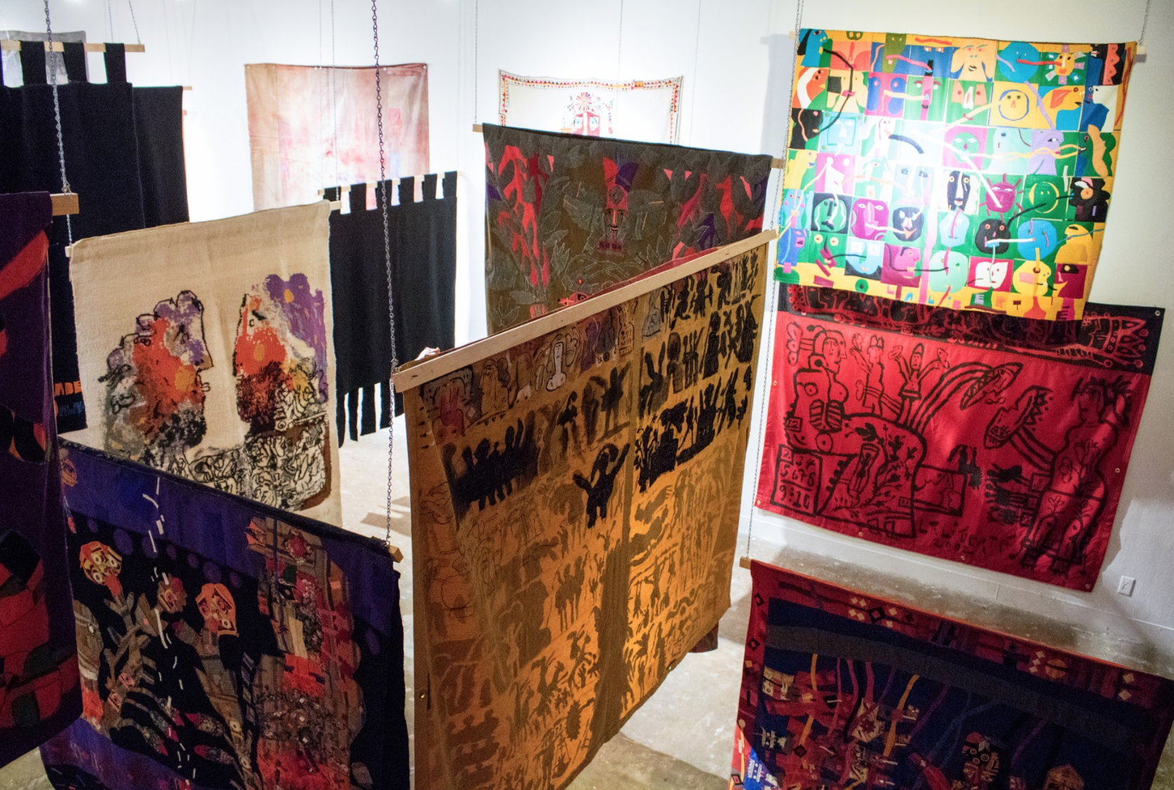 Inside the Mind of a Maker is a document and a fiction, a retrospective and interpretation, of the consciousness of the prolific artist, Norman Laliberté. The stage is set as a cartographic journey through the years and various materials used throughout Laliberté’s career. The forty-two banners displayed in the gallery range from the 1960s to the 2000s and represent his numerous explorations of form and content, from completely abstracted color studies to pictorial likenesses resembling ancient hieroglyphics. Figures, flora, fauna, gods, and ghosts dance upon the tapestries portraying tales and vignettes as complex as the great sagas of antiquity. Think of your time in the labyrinth as a hero’s quest; venture into the banners and experience the intricacies inside the mind of maker…you might be surprised at what you’ll find!