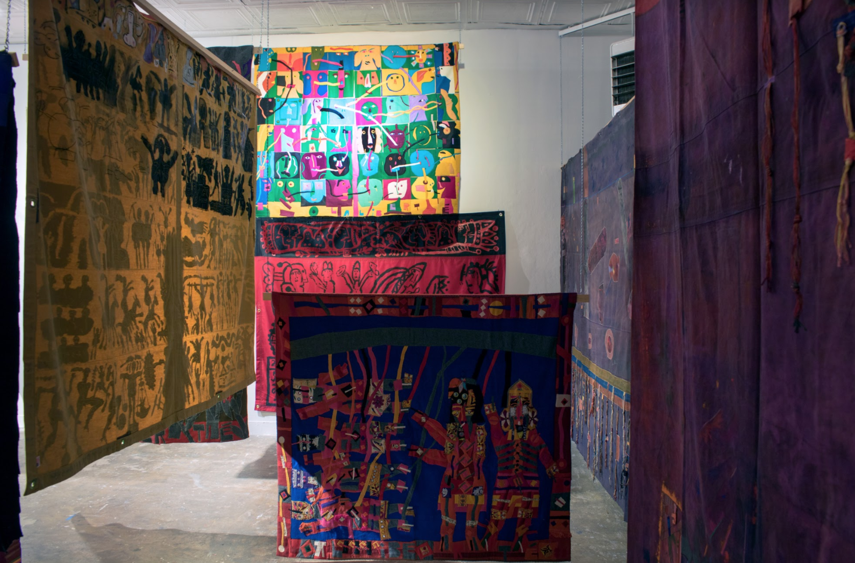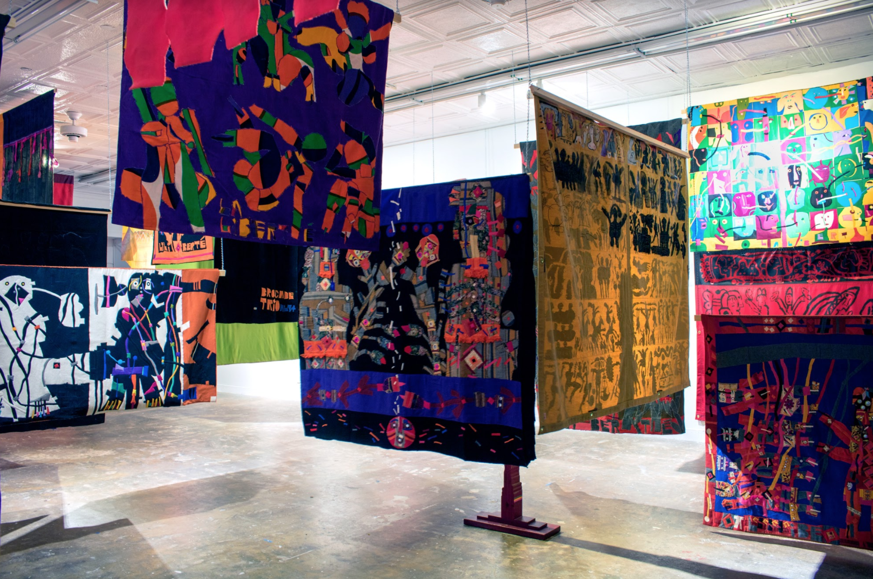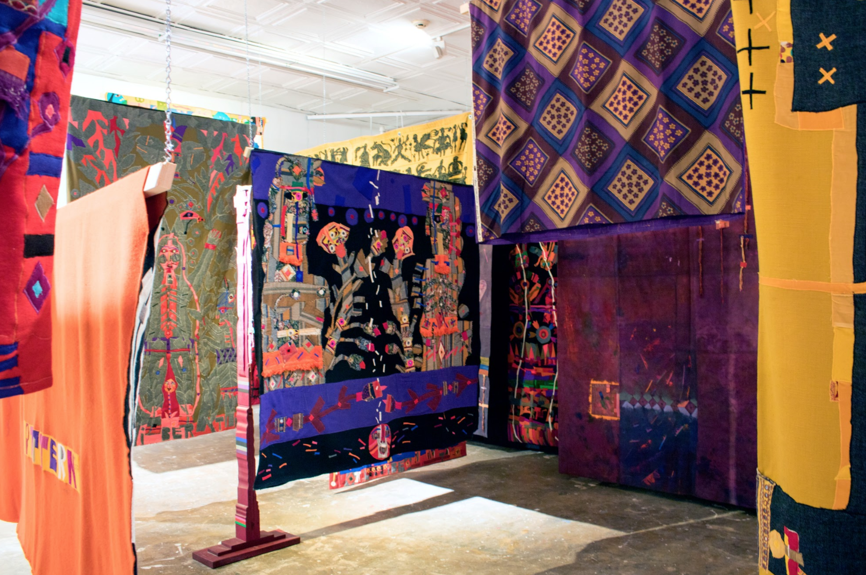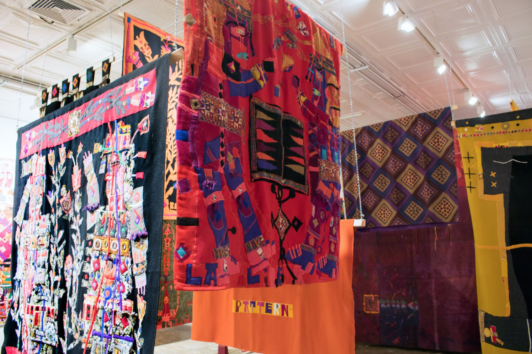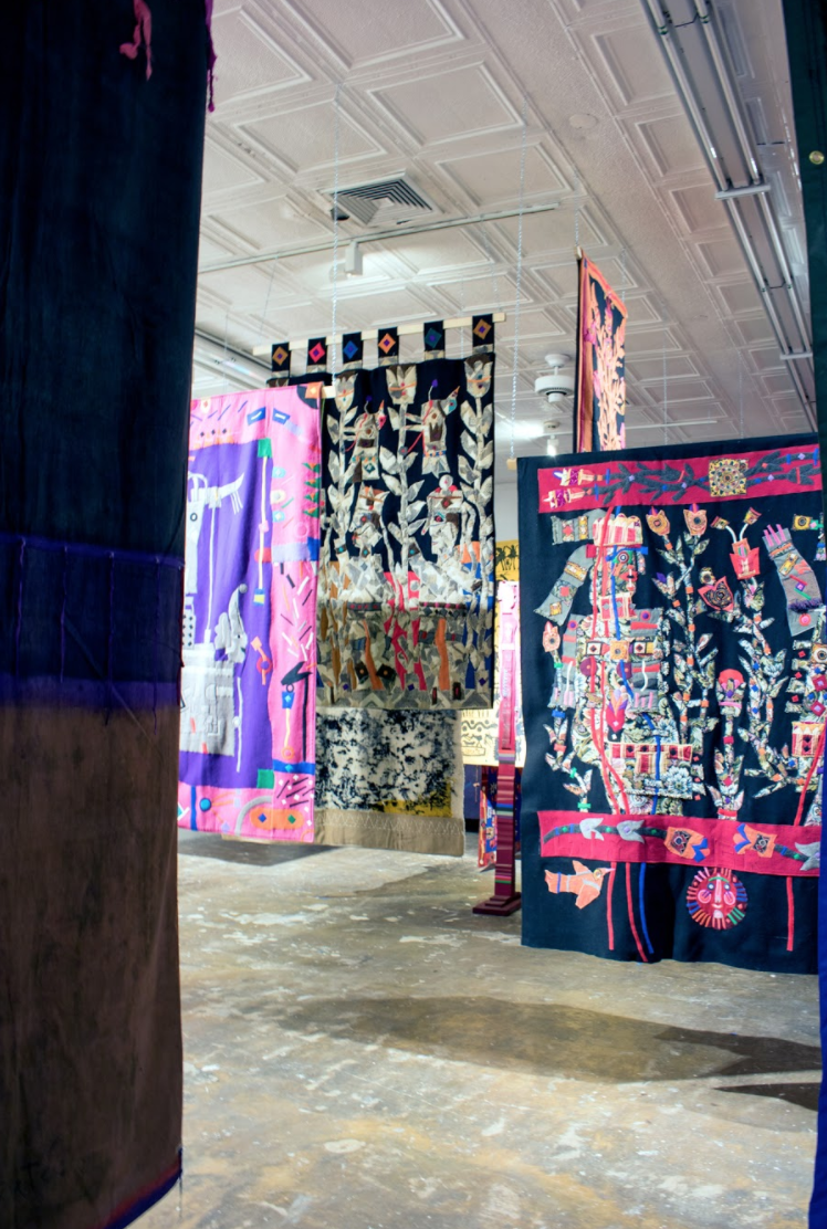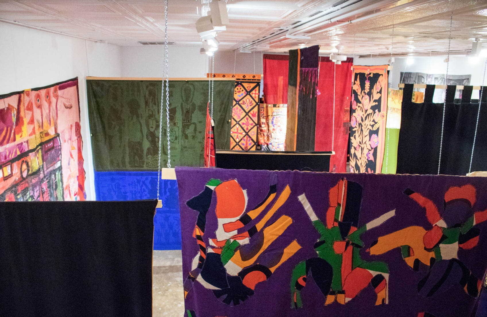 Inside the Mind of a Maker is a document and a fiction, a retrospective and interpretation, of the consciousness of the prolific artist, Norman Laliberté. The stage is set as a cartographic journey through the years and various materials used throughout Laliberté’s career. The forty-two banners displayed in the gallery range from the 1960s to the 2000s and represent his numerous explorations of form and content, from completely abstracted color studies to pictorial likenesses resembling ancient hieroglyphics. Figures, flora, fauna, gods, and ghosts dance upon the tapestries portraying tales and vignettes as complex as the great sagas of antiquity. Think of your time in the labyrinth as a hero’s quest; venture into the banners and experience the intricacies inside the mind of maker…you might be surprised at what you’ll find!