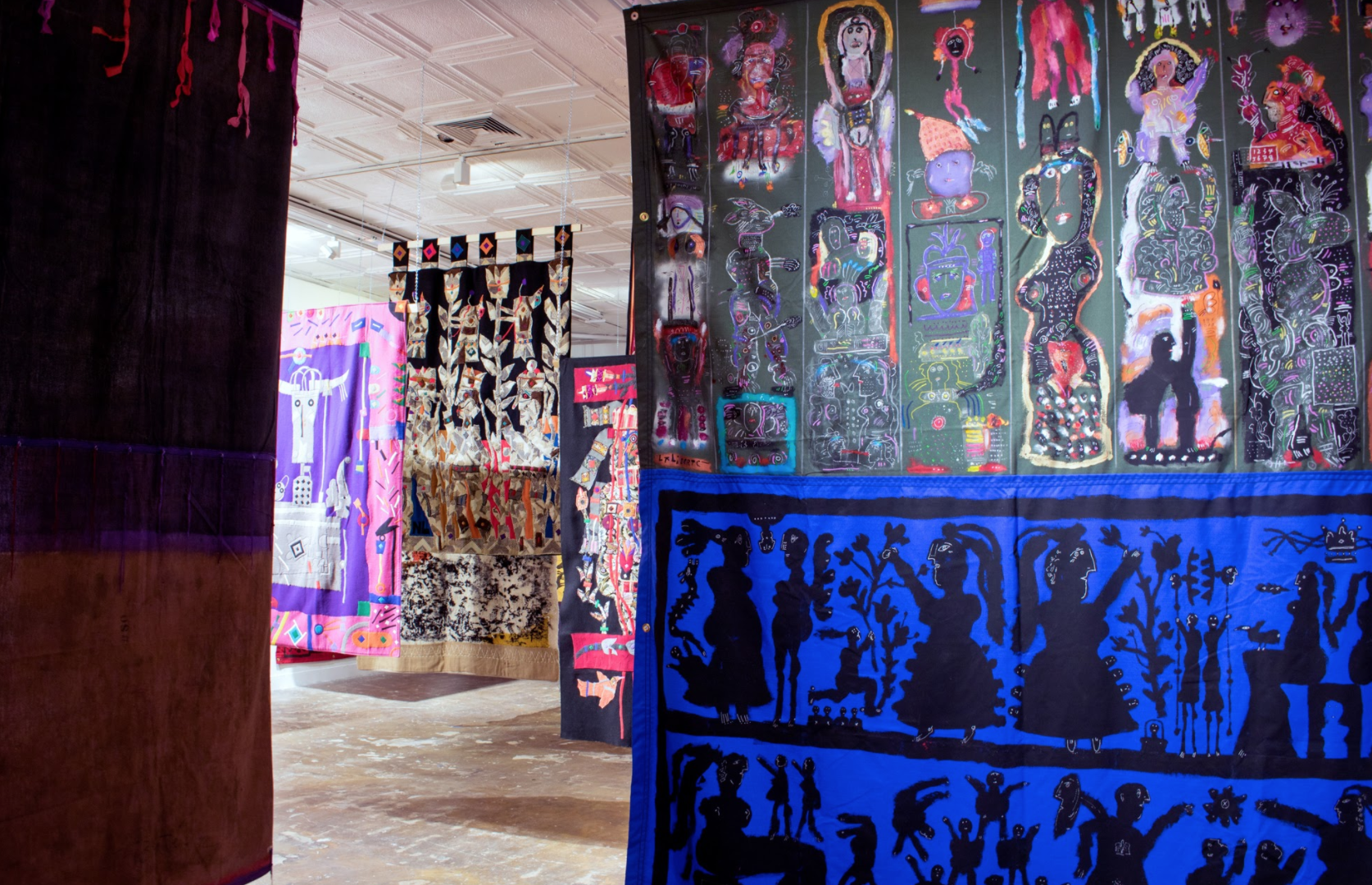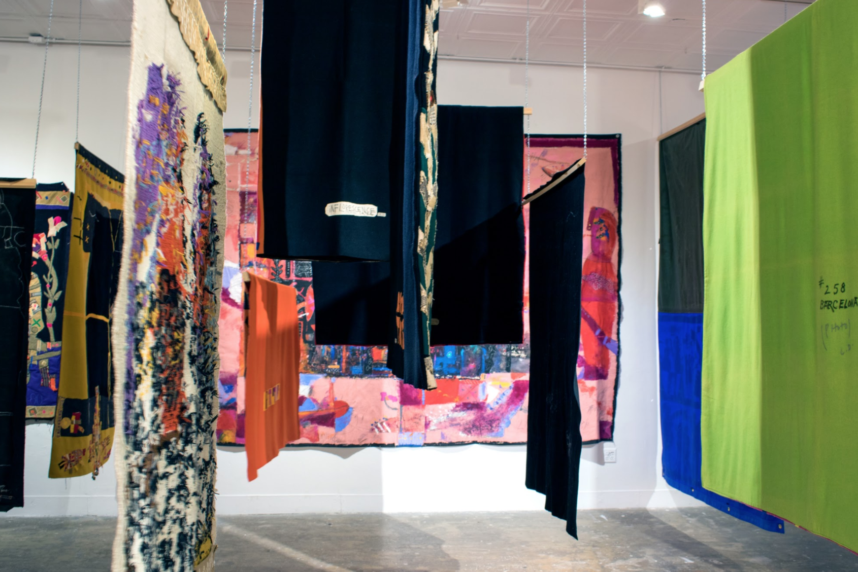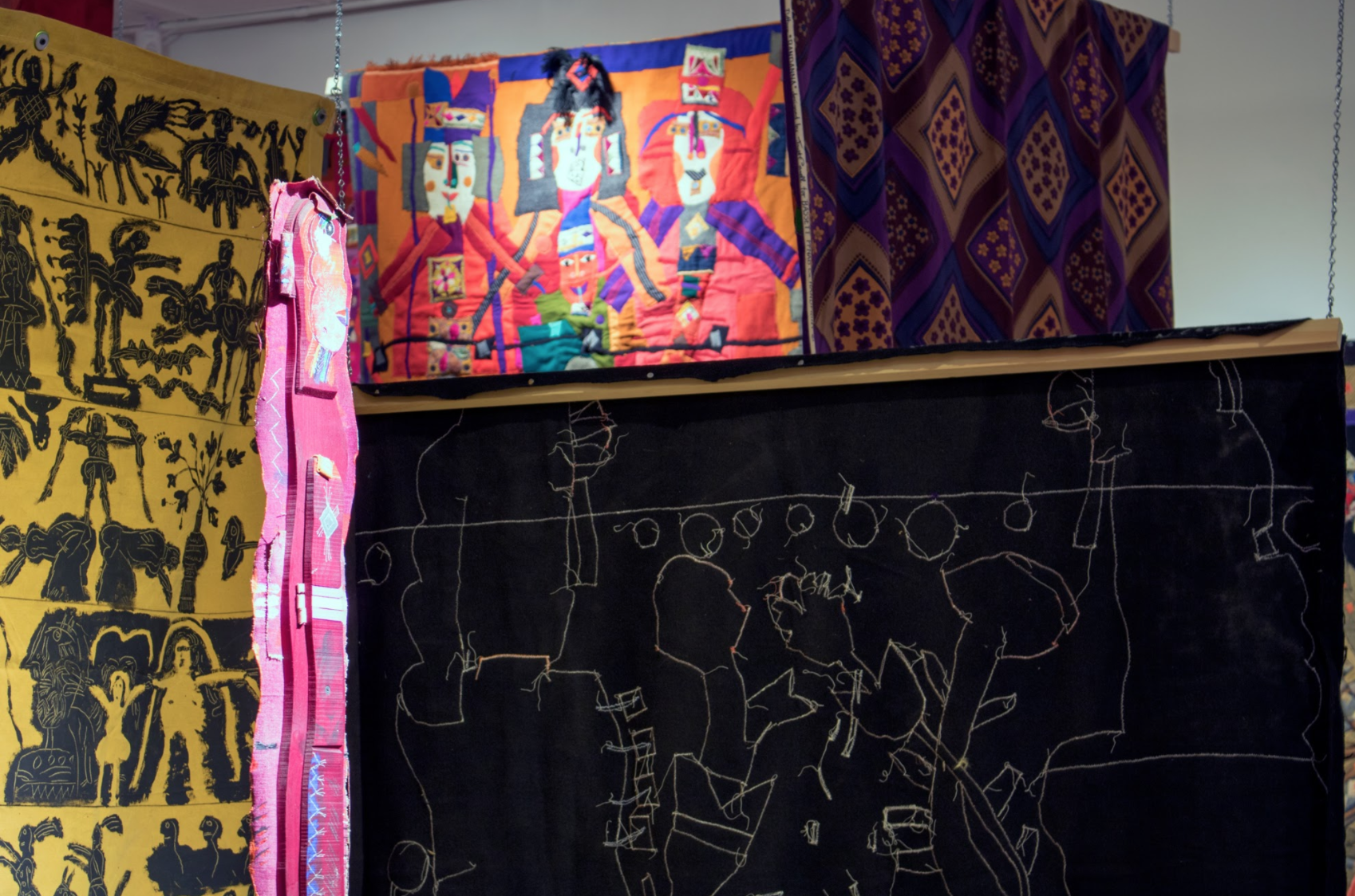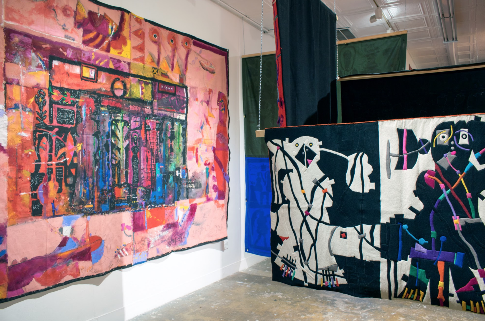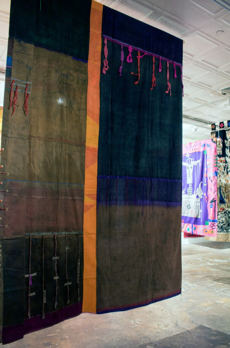 Inside the Mind of a Maker is a document and a fiction, a retrospective and interpretation, of the consciousness of the prolific artist, Norman Laliberté. The stage is set as a cartographic journey through the years and various materials used throughout Laliberté’s career. The forty-two banners displayed in the gallery range from the 1960s to the 2000s and represent his numerous explorations of form and content, from completely abstracted color studies to pictorial likenesses resembling ancient hieroglyphics. Figures, flora, fauna, gods, and ghosts dance upon the tapestries portraying tales and vignettes as complex as the great sagas of antiquity. Think of your time in the labyrinth as a hero’s quest; venture into the banners and experience the intricacies inside the mind of maker…you might be surprised at what you’ll find!