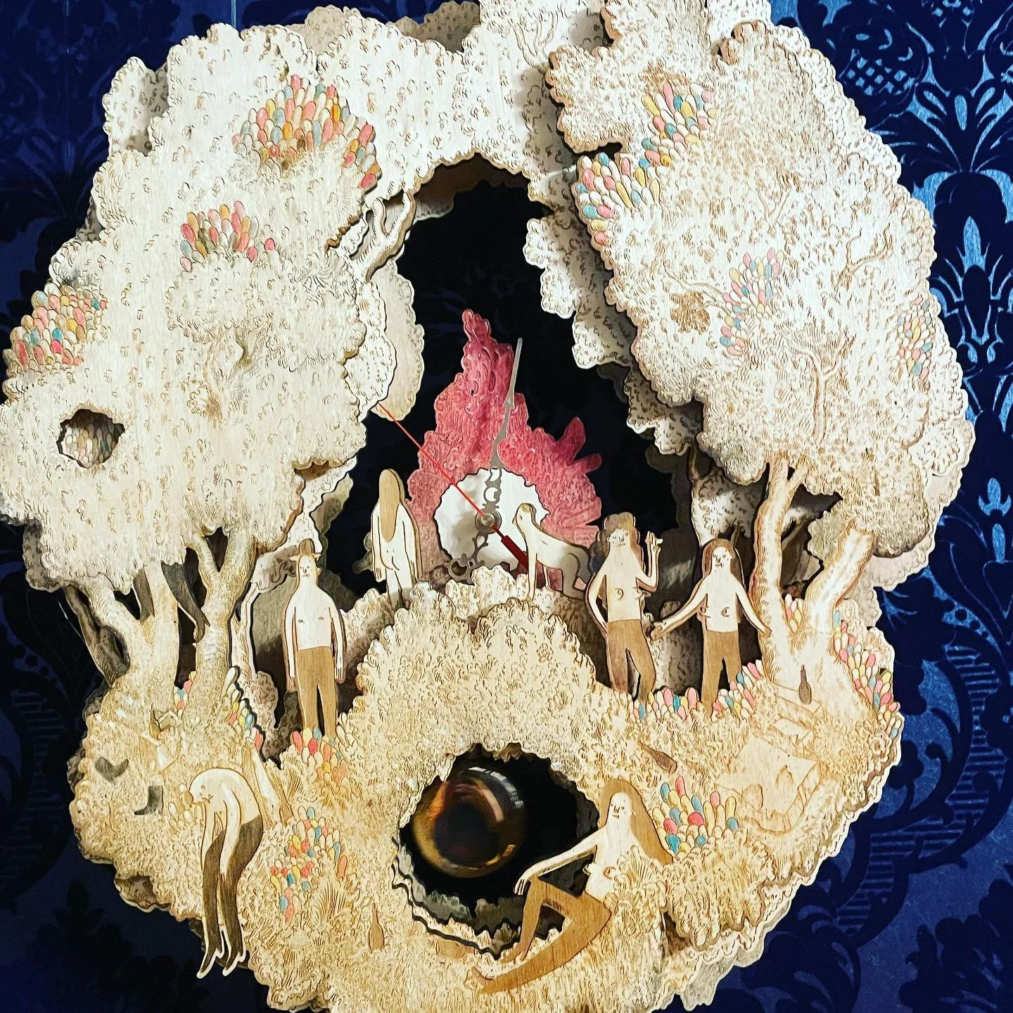 In each exhibition, the sisters attempt to use an entirely new medium; in Sister Season of Sorrow, they are experimenting with clockwork. Each clock is its own environment set around the strictures of the timepiece, but it is also sprawling and blithely unconcerned with being useful. The movements of each clock are attributed to the passing of time but they are swallowed up by the preoccupations of its inhabitants, or entirely ignored as they go about their private miseries.
